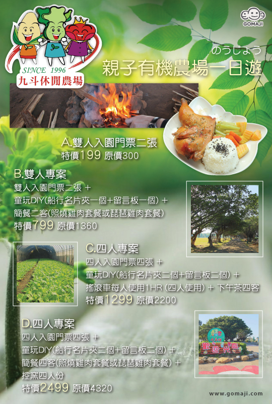 只要199元起,即可享有【桃園-九斗休閒農場】親子有機農場一日遊專案 AB.雙人/CD.四人〈入園門票,B方案另享童玩DIY + 簡餐二客,C方案另享童玩DIY + 搖滾車每人使用1HR + 下午茶四客,D方案另享童玩DIY + 簡餐四客 + 控窯四人份〉